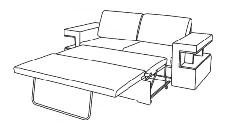 The mechanism for unfolding the sofa, called a "Pantograph," is a modified version of the popular "eurobook" design. At its core, this design features a hinge-rotary mechanism, with one side attached to the stationary frame and the other to the movable part of the sofa (the seat). The side parts of the structure rotate 180 degrees during unfolding. In the process, the legs, along with the seat, move along an arc and lower onto the floor, providing access to the storage compartment for bedding and allowing the placement of the second half of the sofa. To prevent tilting during the transformation into soft furniture, a special spring and synchronizing rod have been added.